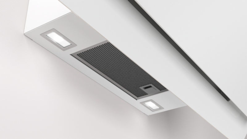 • Campana de pared inclinada de la serie cristal: libertad de movimientos en la zona de cocción y elegancia en toda la cocina.