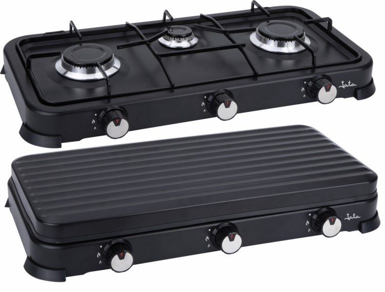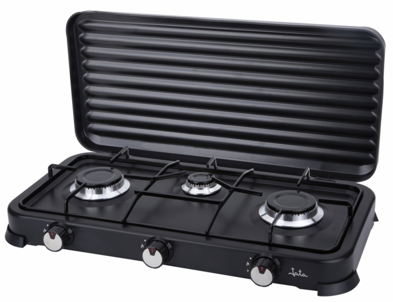 • La cocina de gas jecg2703 es ideal para tus dìas de camping, tiene tres quemadores aptos para butano o propano